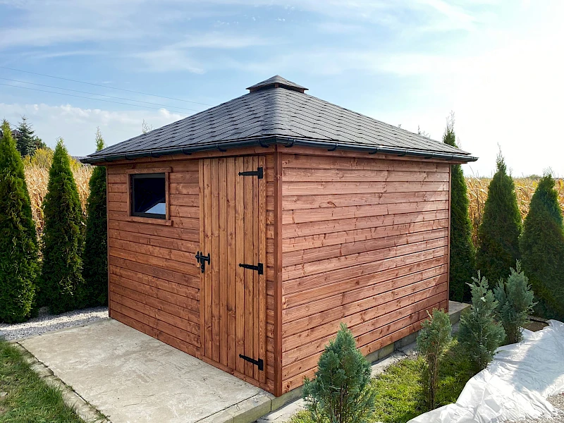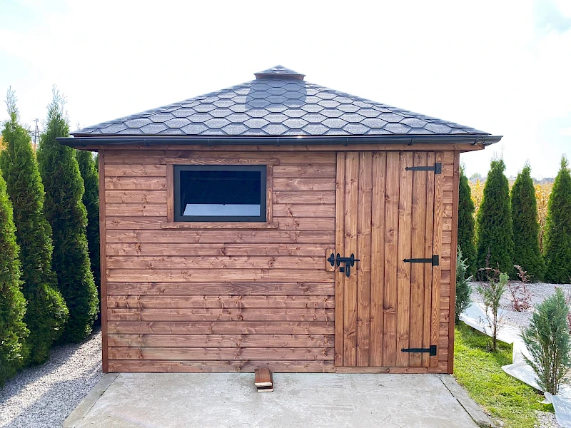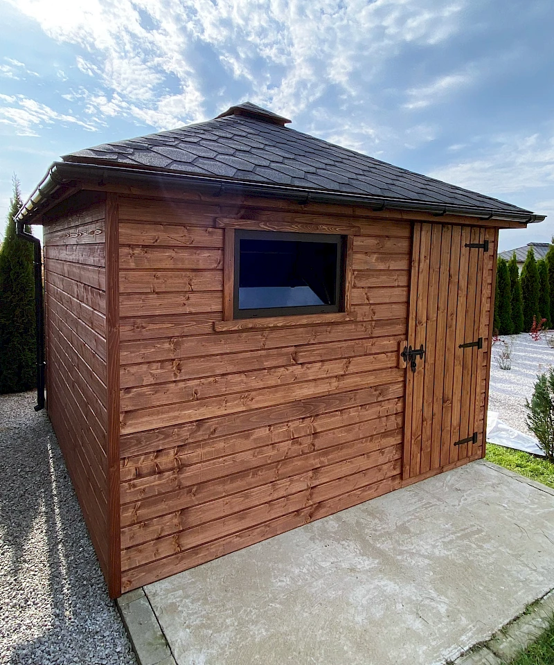 • Domek pokryty gontem bitumicznym (kolor i wzór do wyboru klienta)