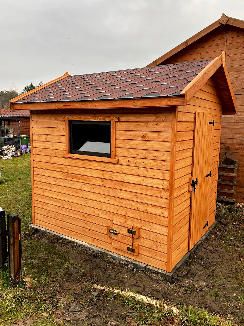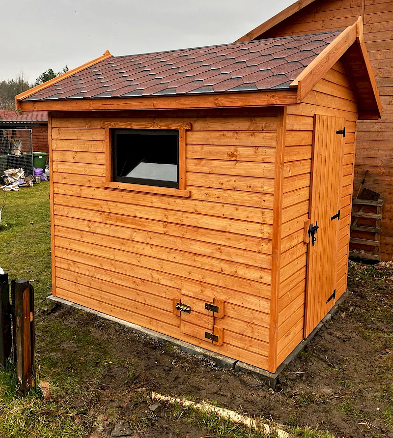 • Ściany obite deską świerkową łączone metodą pióro-wpust o grubości 2cm łącznie z dachem