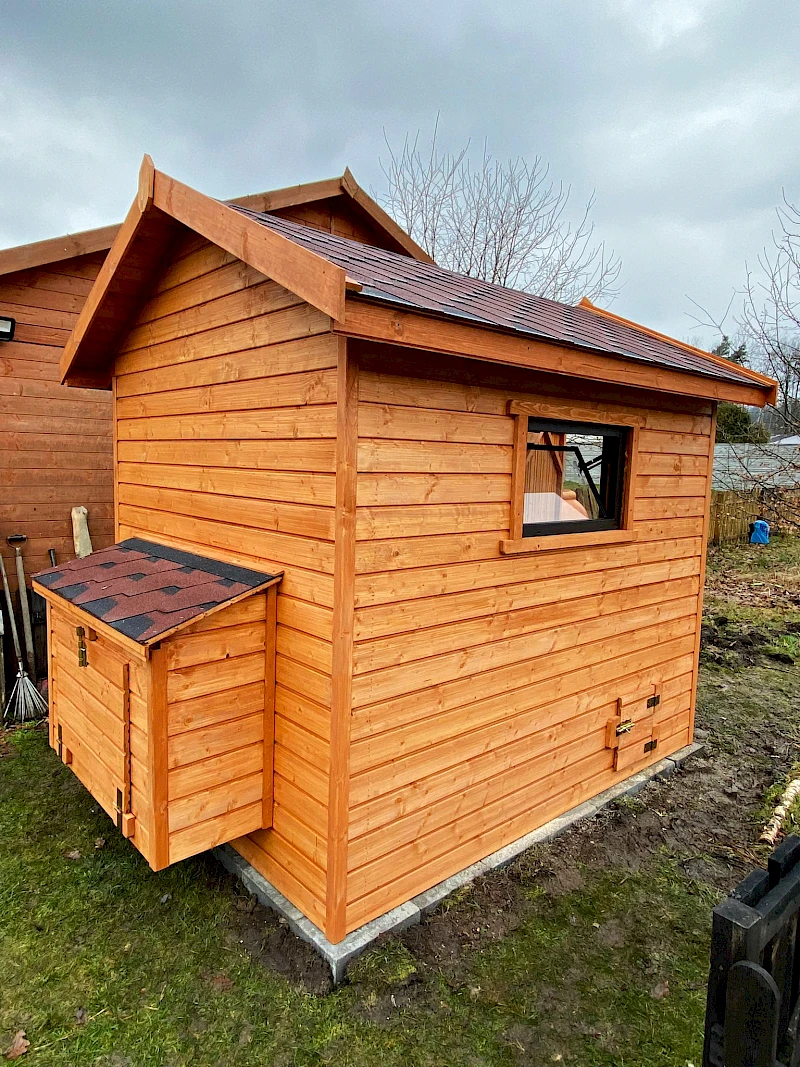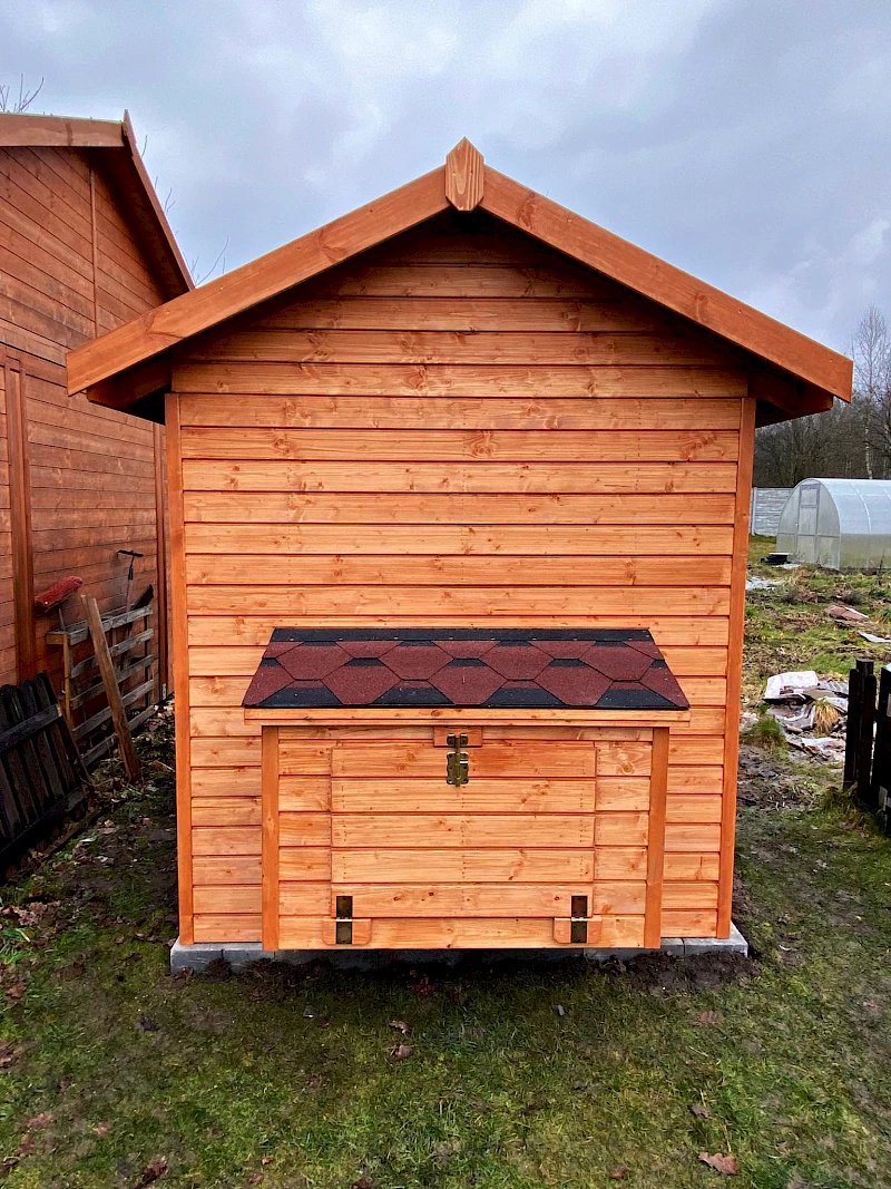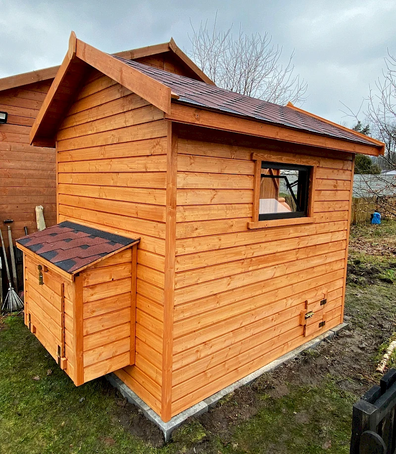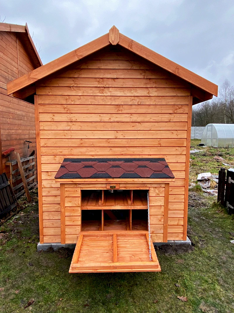 • Kurnik posiada grzęde oraz 6 gniazd umieszczonych na zewnątrz z otwieraną klapą (możliwość umieszczenia gniazd wewnątrz kurnika)