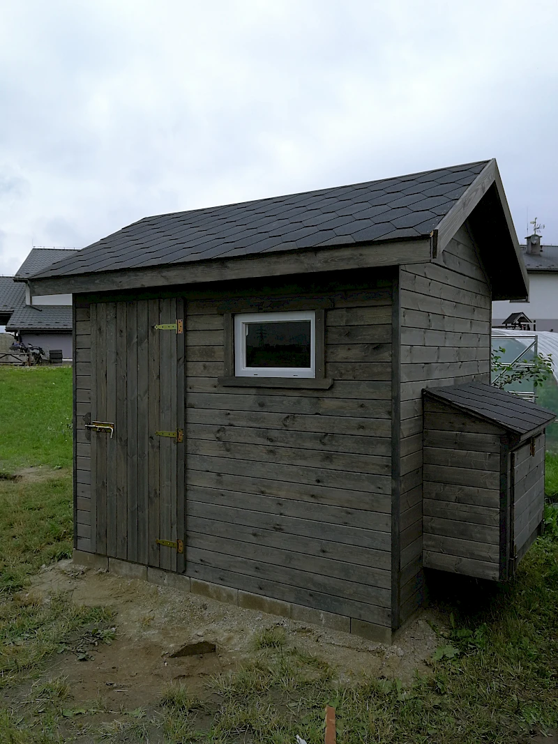 • Ściany obite deską świerkową łączone metodą pióro-wpust o grubości 2cm łącznie z dachem