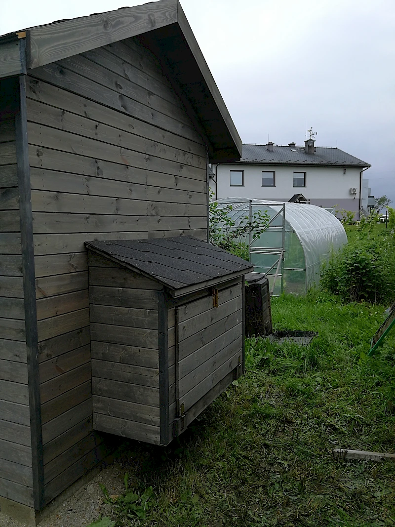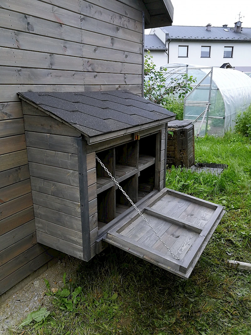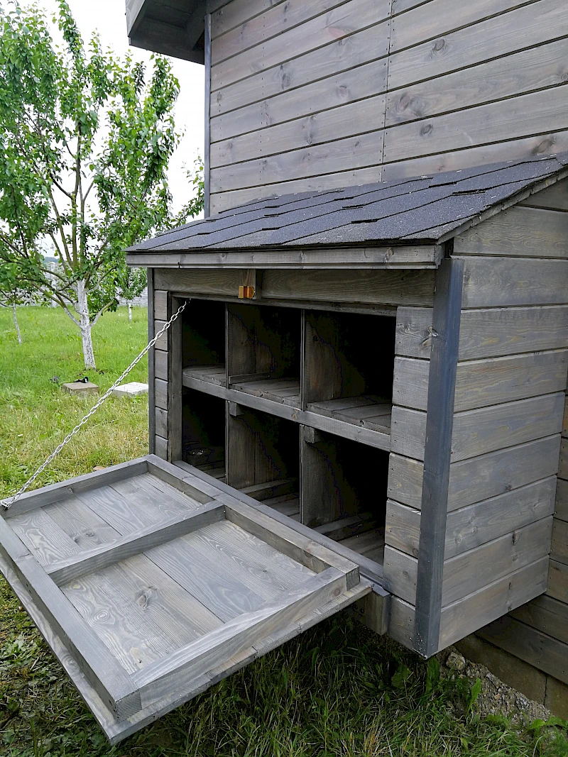 • Kurnik posiada grzęde oraz 6 gniazd umieszczonych na zewnątrz z otwieraną klapą (możliwość umieszczenia gniazd wewnątrz kurnika)